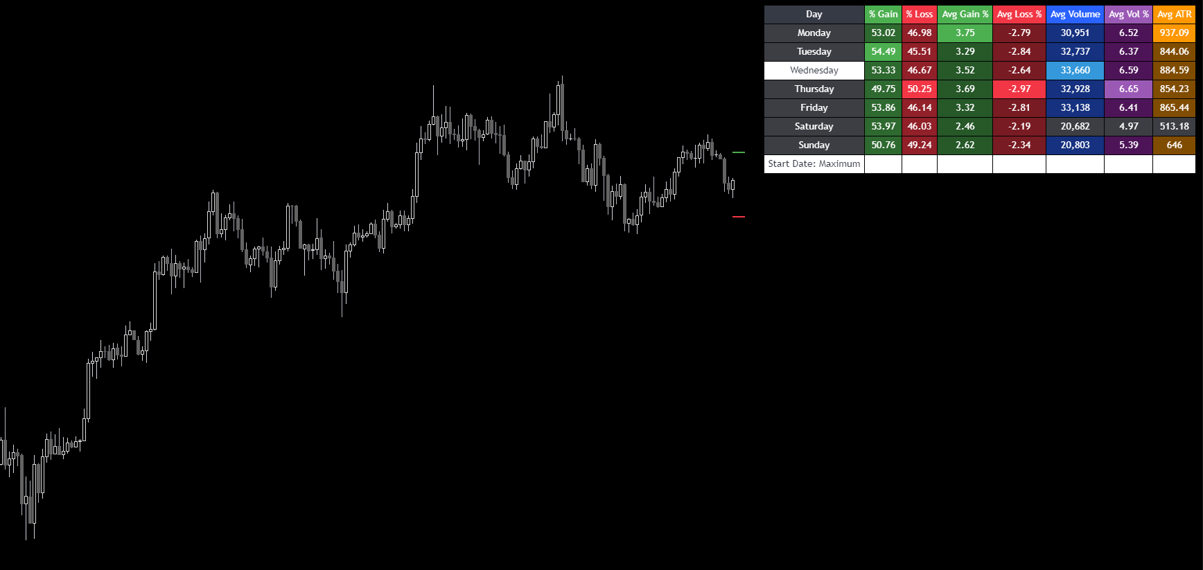 % Gain / % Loss - Displays the distribution of winning versus losing periods to highlight whether the market leans toward strength or weakness.